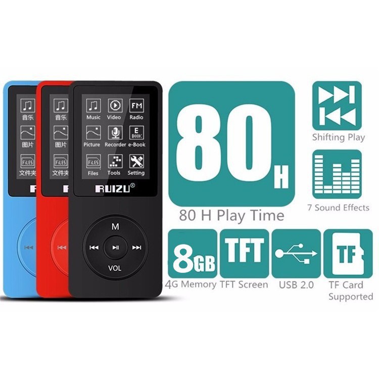 Máy nghe nhạc RUIZU X02 MP3 hỗ trợ nghe nhạc, video, hình ảnh, ghi âm, radio, sách, với khe thẻ nhớ dung lượng lên đến 128GB, cho bạn tha hồ tải lưu hàng ngàn bản nhạc yêu thích.