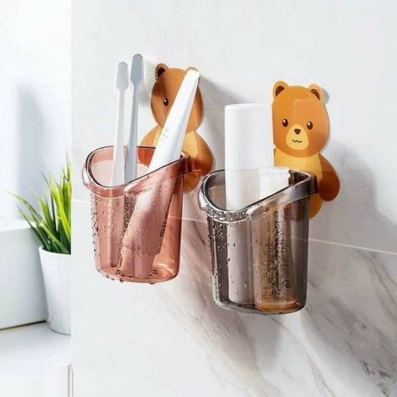 #Hot trend# Cốc cắm bàn chải đa năng hình chú gấu dán(dính) tường- Cốc có lỗ thoát nước, màu sắc nhã nhặn, miếng dán tốt