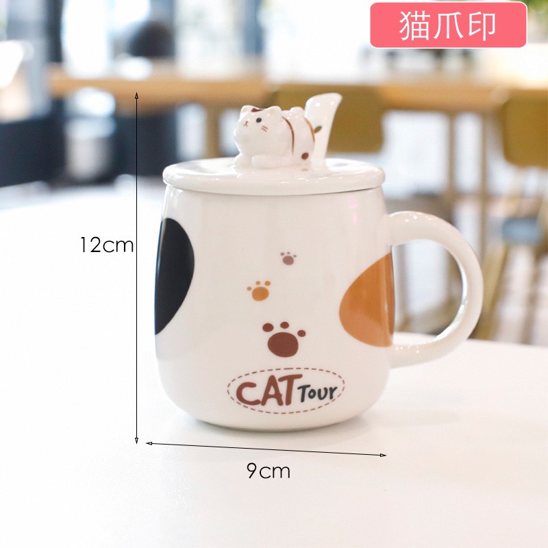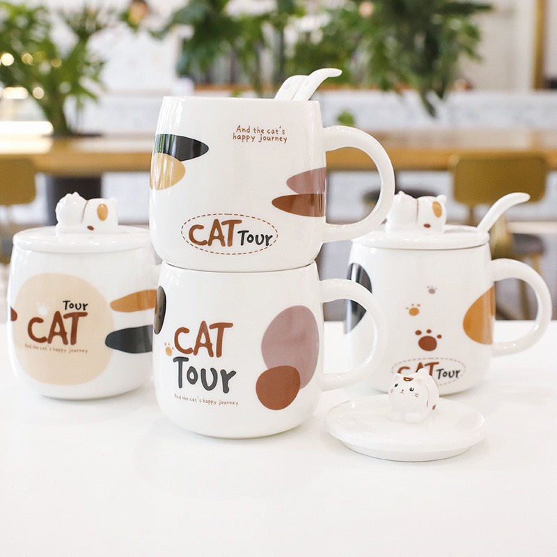 Cốc CAT sứ uống nước cốc gốm sứ cao cấp hình mèo lười cute có nắp đậy uống nước kèm thìa cafe