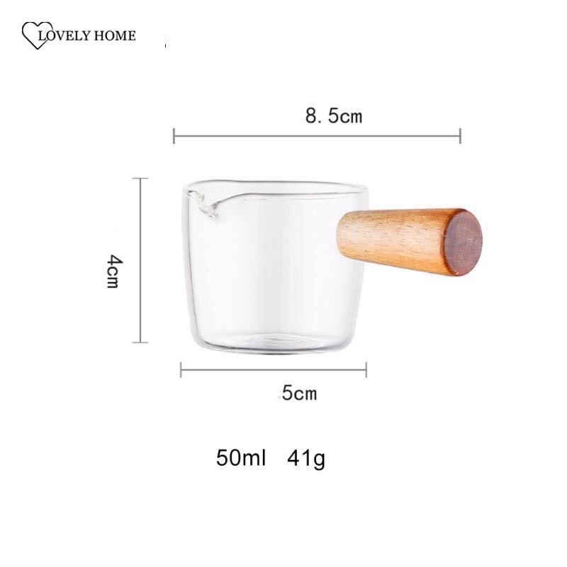 Tên sản phẩm: Cốc thủy tinh chịu nhiệt 75ML dùng đo lường cho tách cà phê Espresso có tay cầm bằng gỗĐặc điểm: