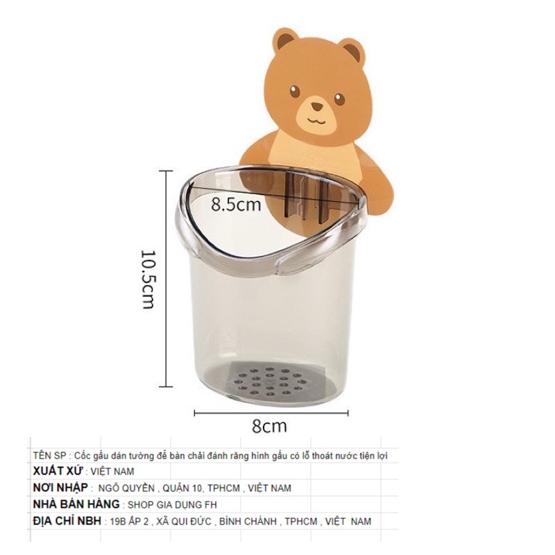 NGUỒN SẢN PHẨM:TÊN SP : Cốc gấu dán tường để bàn chải đánh răng hình gấu có lỗ thoát nước tiện lợi , CHẤT LIỆU NHỰA, kèm miếng dán tường.