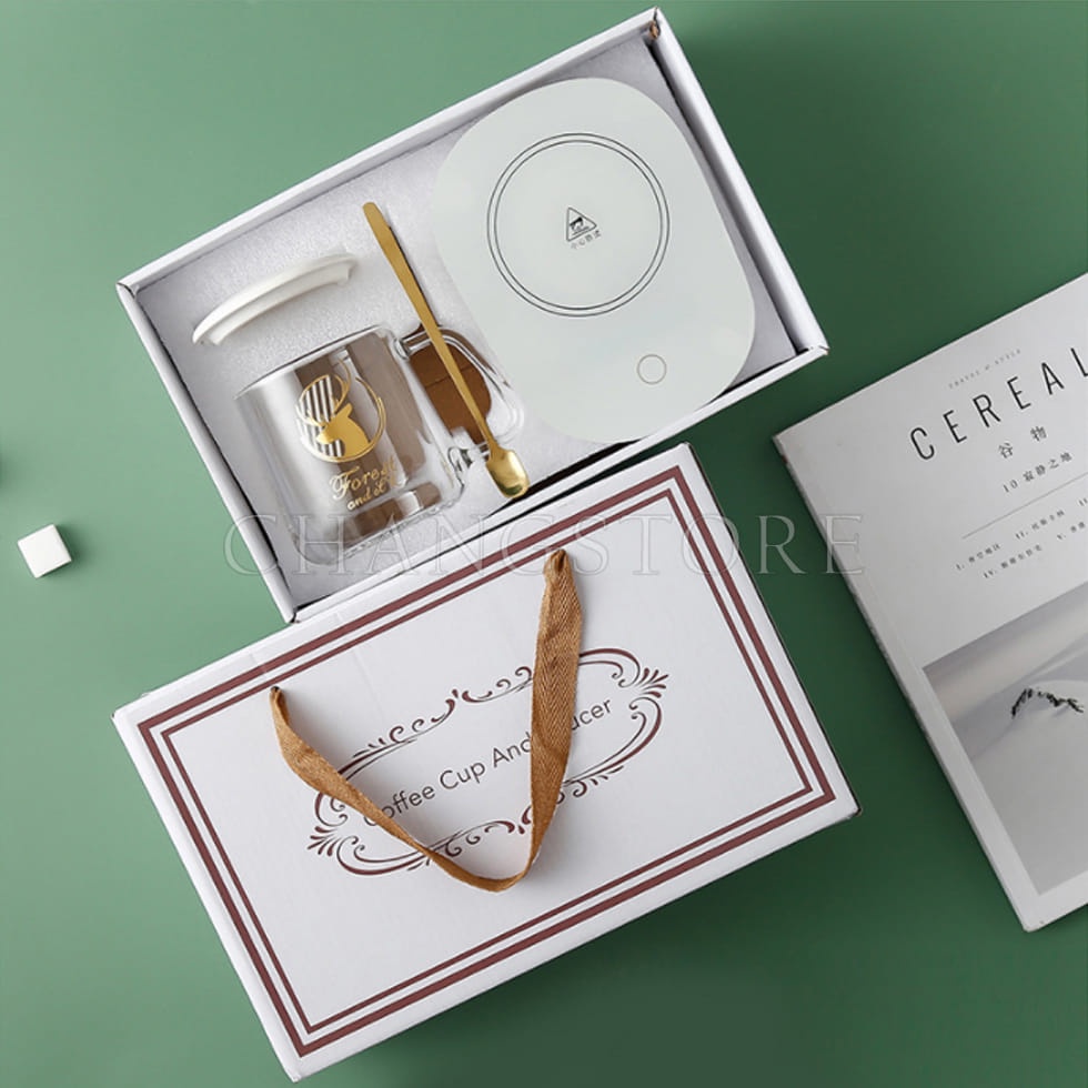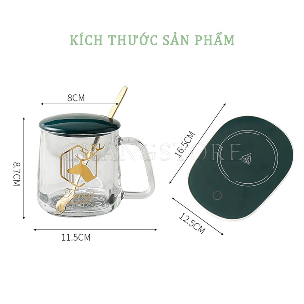 Cốc Hâm Nóng Bằng Thủy Tinh, Ly Thủy Tinh Kèm Đế Điện Hâm Nóng Cafe, Sữa, Trà + Tặng Thìa Mạ Vàng Tiện Lợi