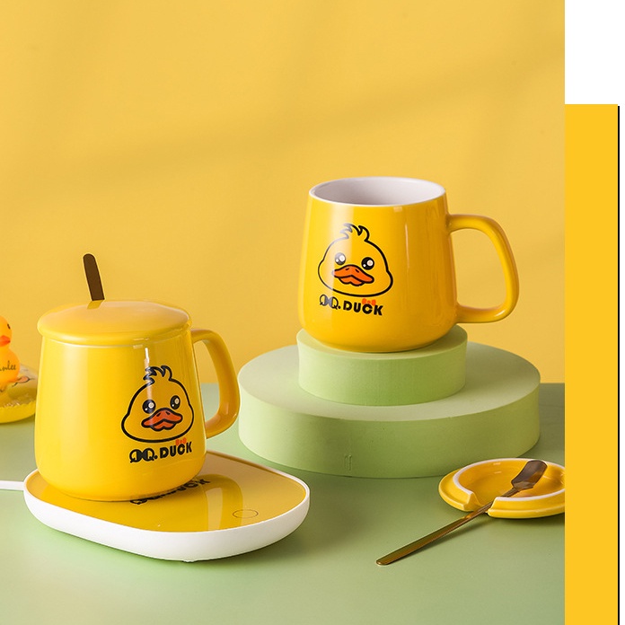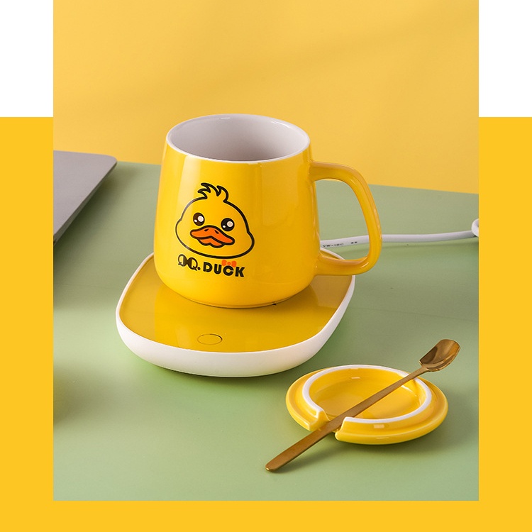 Cốc hâm nóng đồ uống thủy tinh QQ DUCK kèm đế điện, cốc chưng yến, cafe, sữa tặng thìa mạ vàng- FULL BOX ( VỊT VÀNG)