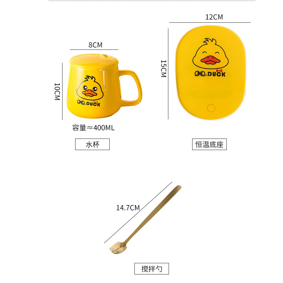 Cốc hâm nóng đồ uống thủy tinh QQ DUCK kèm đế điện, cốc chưng yến, cafe, sữa tặng thìa mạ vàng- FULL BOX ( VỊT VÀNG)Mô tả: