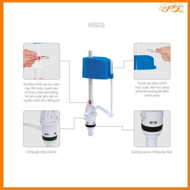 Cọc phao cấp có tác dụng lấy nước cho két bồn cầu. Đóng khóa van nước khi két bồn cầu đầy nước.Cọc cấp dùng thay thế được cho gần như mọi loại bồn cầu phổ thông.
