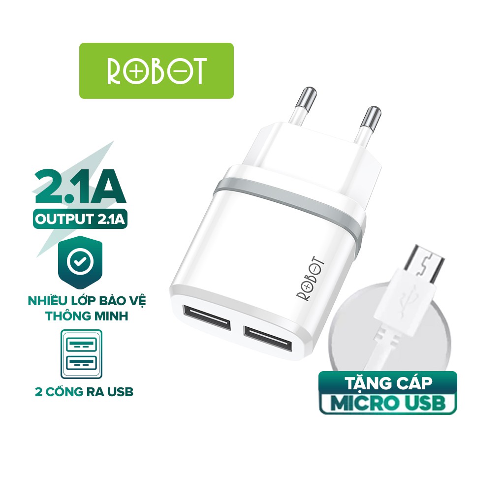CỐC SẠC 2 CỔNG USB ROBOT RT-K9 - 2 CỔNG SẠC RA SẠC NHIỀU THIẾT BỊ IPHONE ANDROID - KÈM CÁP MICRO USBSản phẩm chính hãng ROBOT