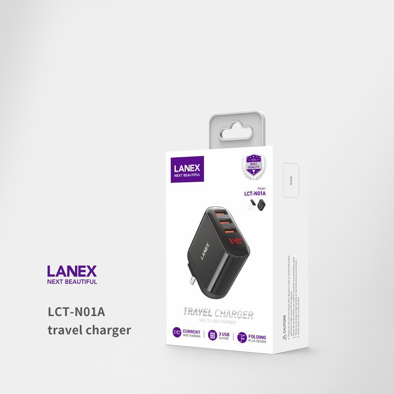 + Cóc sạc nhanh LANEX LCT - N01A được trang bị 3 cổng USB với mức điện áp khác nhau. Bao gồm một cổng 1.2A, một cổng 2.0-2.4A và 1 cổng 2.4-3.0A.