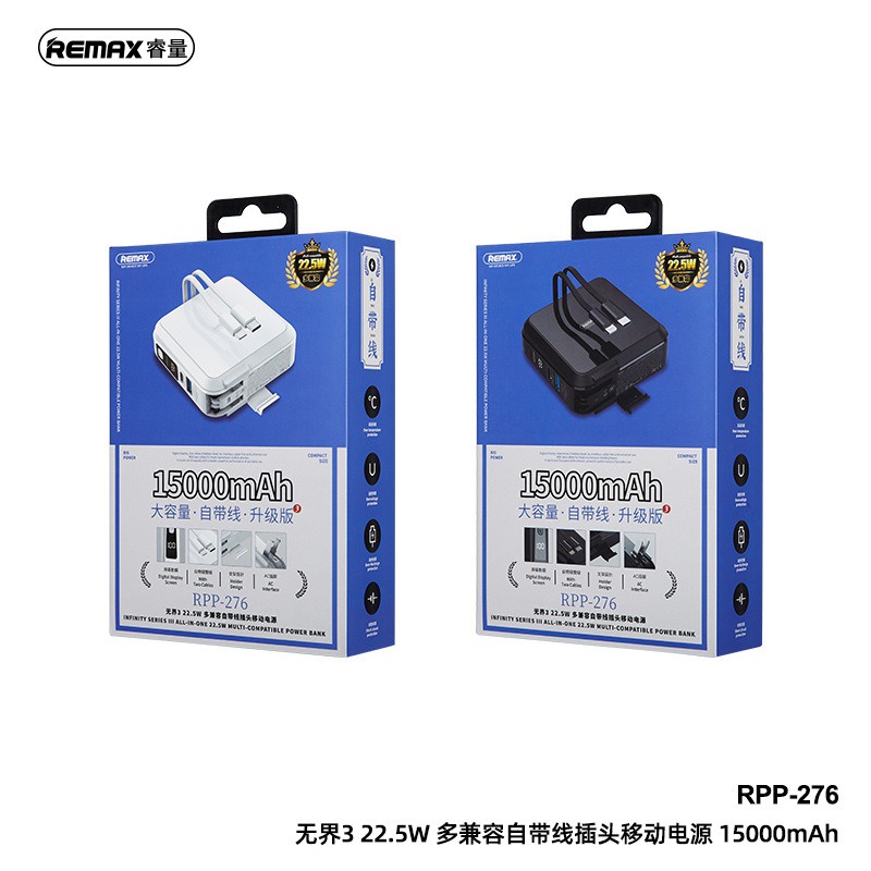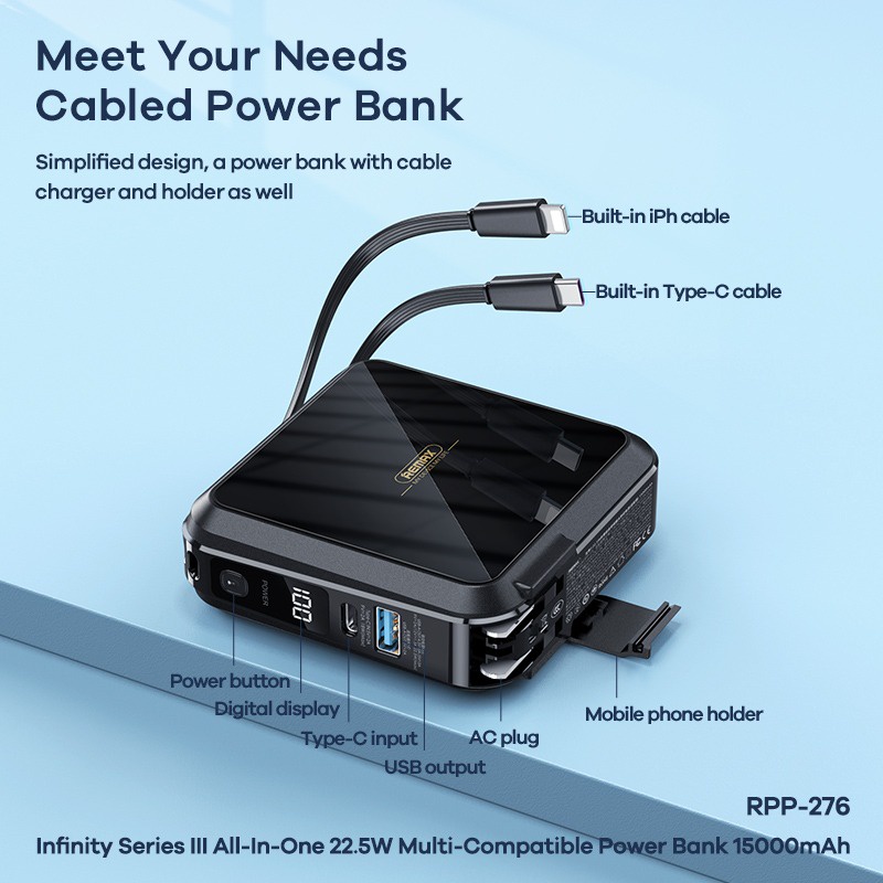 Điện Thoại & Phụ Kiện > Phụ kiện > Sạc dự phòng & Pin > Sạc dự phòng || Cốc sạc nhanh kiêm pin dự phòng Remax RPP-276 Infinity All In One 15000mAh tích hợp cáp sạc Type C, Lightning và giá đỡCòn hàng