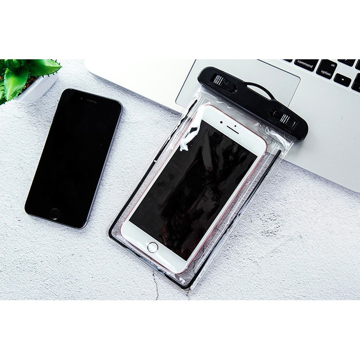 Túi đựng điện thoại chống nước có thiết kế khóa gài kín đáo, ngăn bụi bẩn, trầy xước do va chạm và đặc biệt chống thấm tốt, an toàn ngay cả trong môi trường nước.- Túi được làm từ chất liệu nhựa dẻo trong suốt, có tính năng cảm ứng nhiệt, giúp người dùng có thể sử dụng điện thoại để nghe, nhận cuộc gọi cũng như chụp ảnh dưới nước.