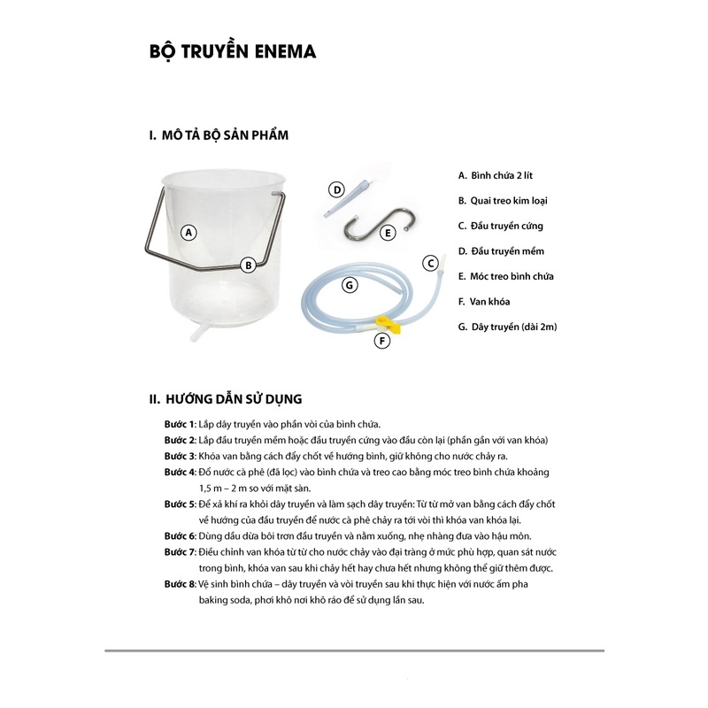 - 1: Túi đựng + bình chứa nhựa 2 lít có quai + móc treo kim loại + dây silicone 2 m + van khóa + đầu truyền cứng và đầu truyền mềm.