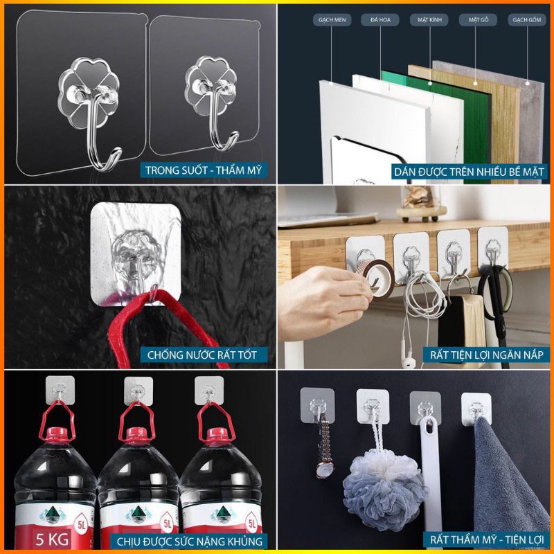 ♘ Móc dán tường Treo Đồ Trong Suốt T10 tiện dụng bền, chịu nước, không bong tróc.