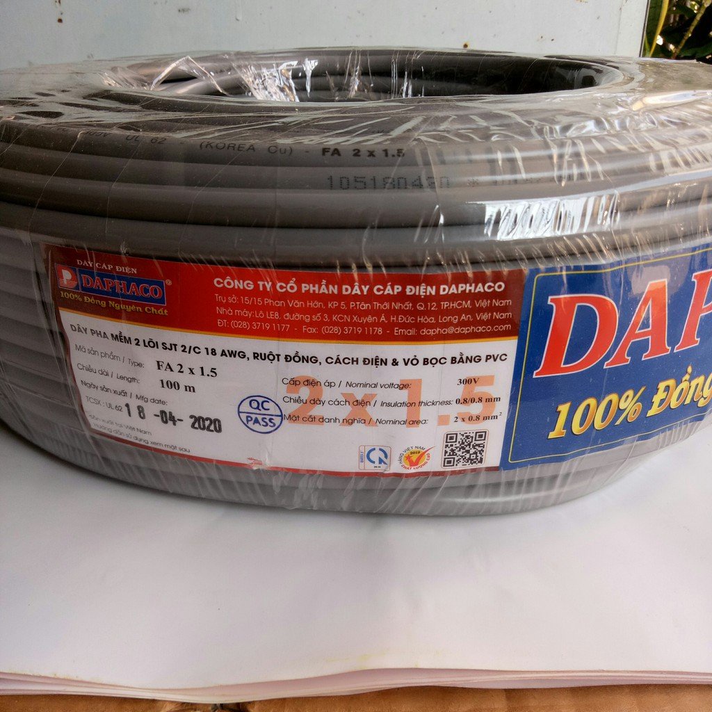 + Quy cách: Dây pha mềm 2 ruột đồng (Cấp 5), cách điện và vỏ bọc PVC