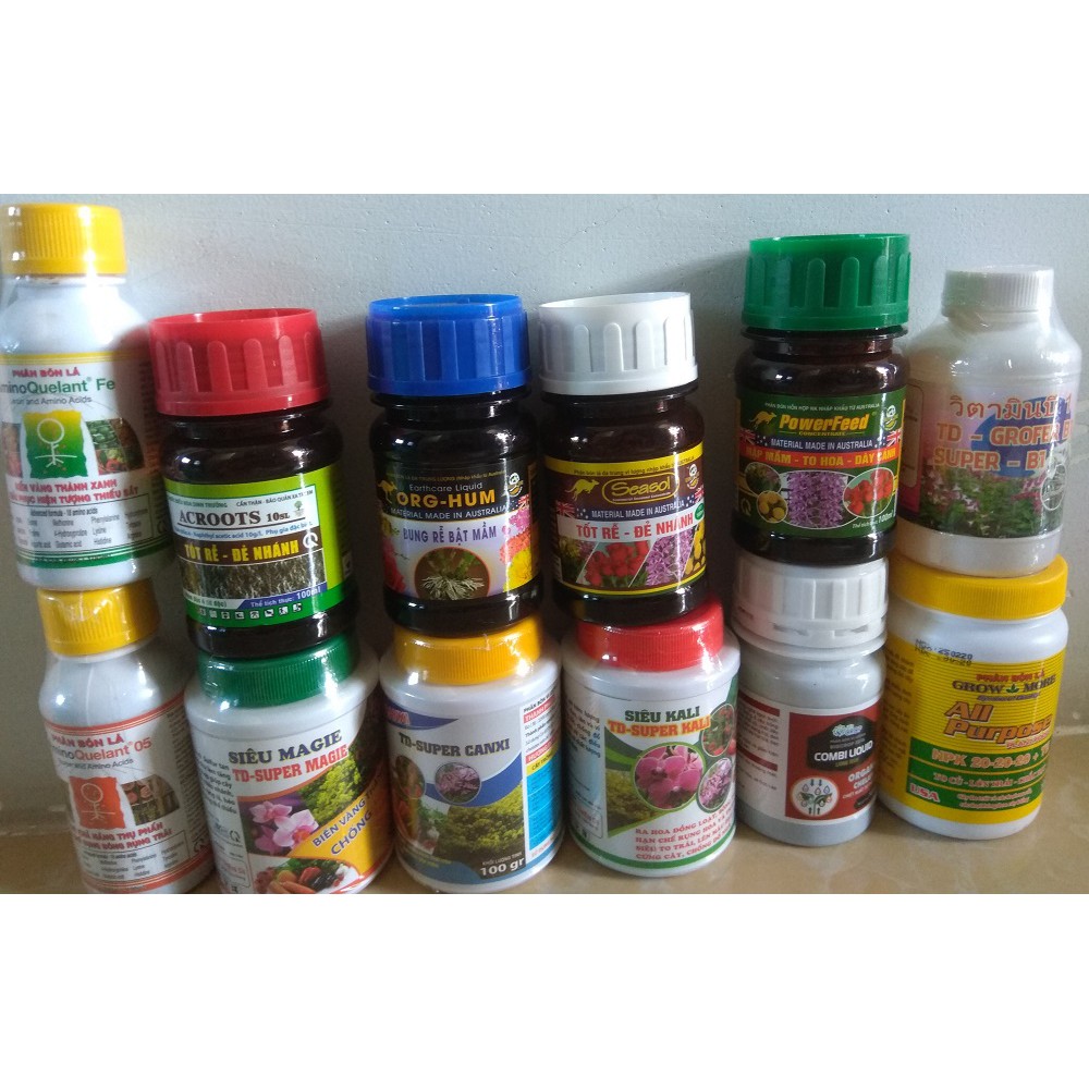 GỒM 12 LOẠI :Acroots, Org hum, Combi liquid, Siêu canxi, siêu kali, siêu Magie, Amino Fe, Amino Bo, NPK 20-20-20 , Vitamin B1 Grofer, Power feed, Seasol