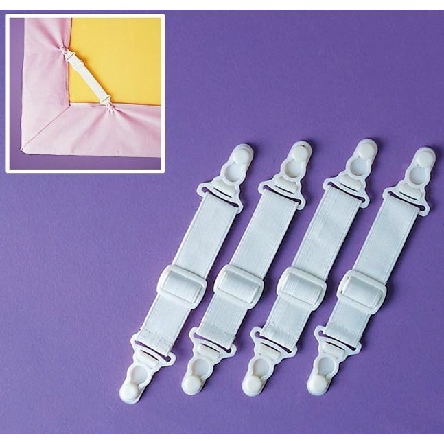 Chiếc kẹp được làm bằng chất liệu thun có độ co giãn tốt, đầu kẹp được làm bằng nhựa chắc chắn.- 4 chiếc kẹp gắn ở 4 đầu drap nệm sẽ giúp giữ ga luôn ở vị trí cố định, không bị xê dịch.