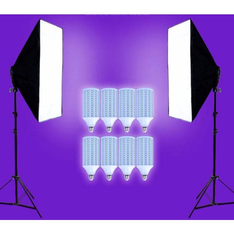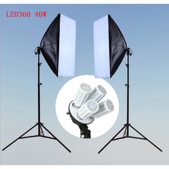 Bộ sản phẩm bao gồm: 2 chân đèn 2.6m, 2 Softbox 50x70cm đui 4, 8 Bóng đèn Led360 40W