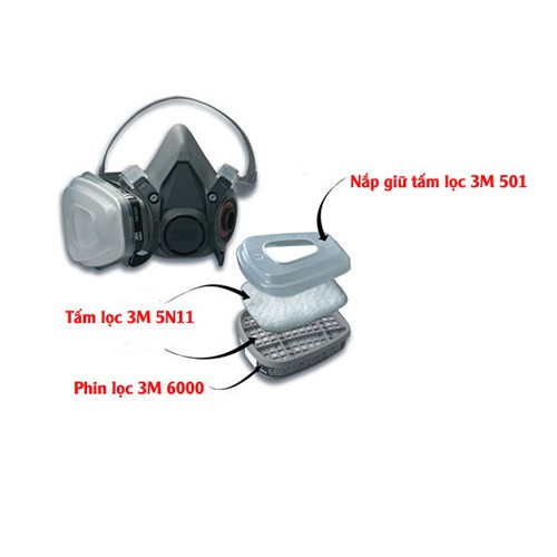 - Tấm lọc bụi 3M 5N11 và nắp giữ 3M 501 kết hợp với các phin lọc và mặt nạ 2 phin của 3M giúp người sử dụng bảo vệ hô hấp trong môi trường có hơi hóa chất vô cơ, hữu cơ và bụi.