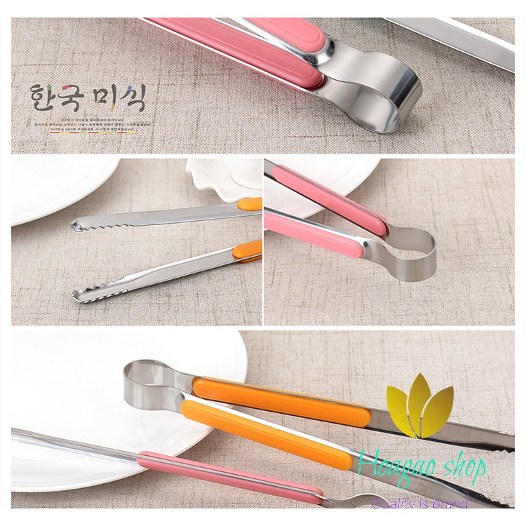 ❃ Thiết kế tay cầm dài với chất liệu nhựa ABS cao cấp ở bên ngoài giúp bạn tránh nóng và không bị ảnh hưởng bởi hơi nóng phả ra từ lò nướng đồng thời giúp chống trơn trượt và cách nhiệt khi cầm trực tiếp vào dụng cụ khi nấu ăn. Thép không gỉ cao cấp cứng giúp thức ăn được kẹp chặt bằng một lực vừa đủ, kể cả thức ăn có kích thước lớn.