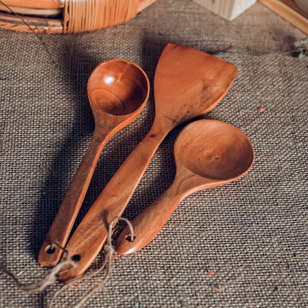 Combo: 1 sạn xào gỗ/ 1 vá canh/ 1 vá cơmBộ dụng cụ nấu ăn được làm từ gỗ tự nhiên, sử dụng bền và àn toàn