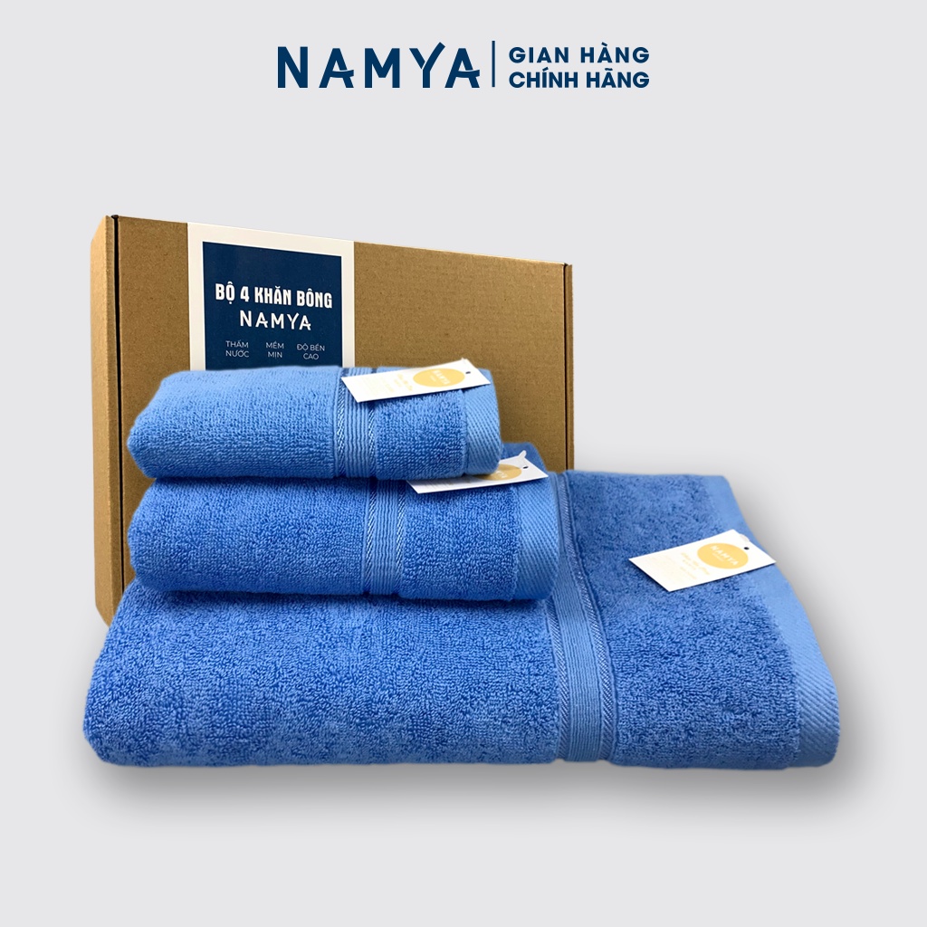 Giới thiệu Combo 4 khăn bông NAMYA mềm mại, hút nước, độ bền cao, kích thước 60x120/35x80/30x50cm