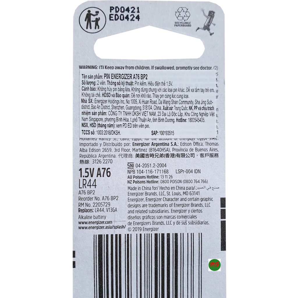 - Mã SP : Energizer A76, 1 số tên gọi khác như LR44, AG13, PX76A, V13GA, LR1154, GPA76