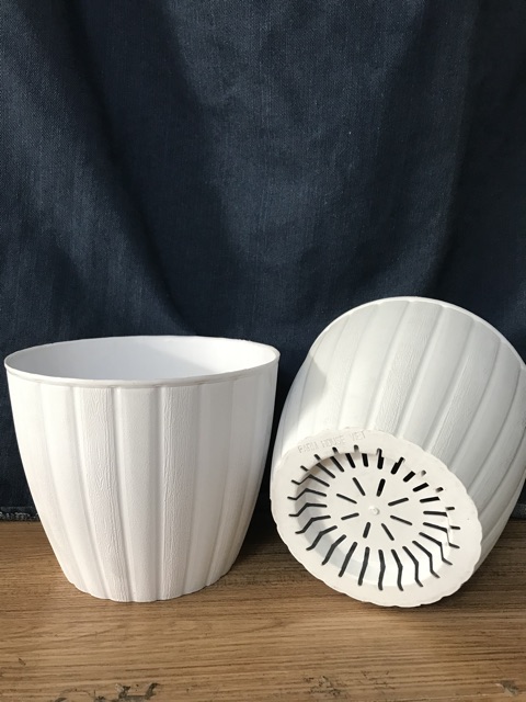 Chậu trắng kiểu sọc đứng đơn giản dễ thương, thân chậu hơi bầu, đáy chậu thiết kế dạng lưới, thoát nước dễ dàng nhưng lại không làm rớt đất trong chậuNhựa tốt, mềm dẻo. Không kén cây, phù hợp với mọi không gian trưng bày trong nhà, căn phòng, công ty .v.v...