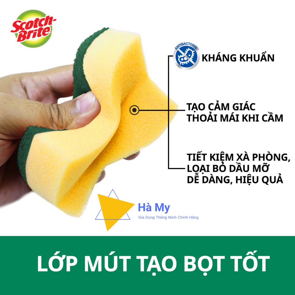 Miếng Rửa Chén Bát 3M Scotch Brite Thế Hệ Mới Kháng Khuẩn,Siêu SạchMiếng rửa chén bát 2 mặt gồm sợi cước - mút xốp, thiết kế dễ cầm nắm khi sử dụng. Mặt cước với các hạt mài li ti đánh rửa hiệu quả, làm sạch nhanh các vệt thức ăn dính cháy.