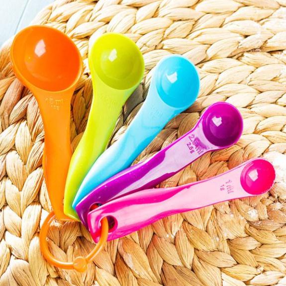 Bộ thìa đong với nhiều màu sắc rực rỡ được làm bằng nhựa nguyên chất, an toàn.