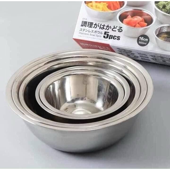 Giới thiệu Combo 5 Thau Bằng Inox Cao Cấp, 5 Thau 5 Kích Thước Khác Nhau Có Ghi Thể Tích Tiện Lợi (Hộp Trắng)