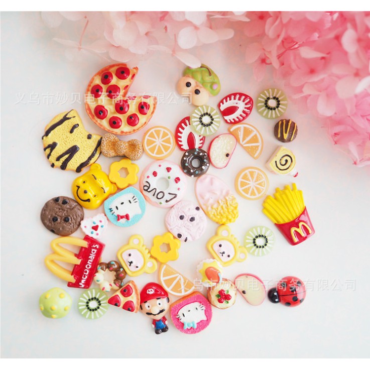 Các mẫu mô hình Mario, McDonald, trái cây ...trang trí nhà búp bê, tiểu cảnh, vỏ điện thoại, kẹp tóc, đính áo, dép Crocs, DIY.Kích thước : 1.7 x 2.7cm