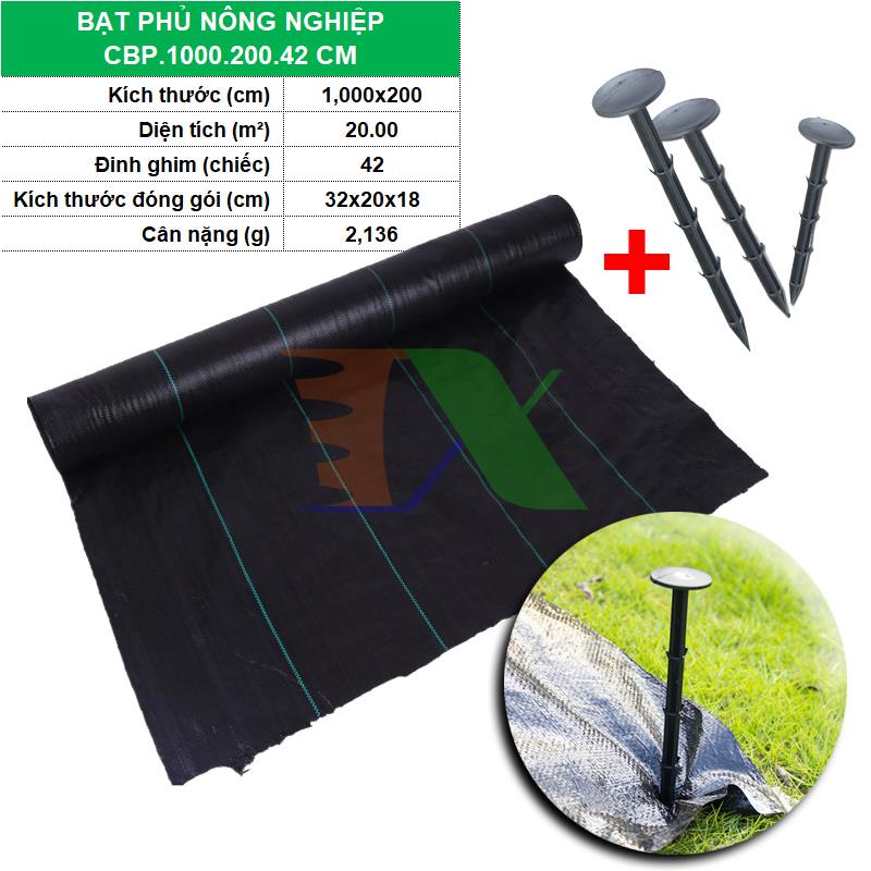 Giới thiệu Combo Bạt phủ nông nghiệp CBP.1000.200.42, Bạt pp giữ ẩm cho đất diệt cỏ dại kèm Đinh ghim (1'000x200 cm) + 42 ghim