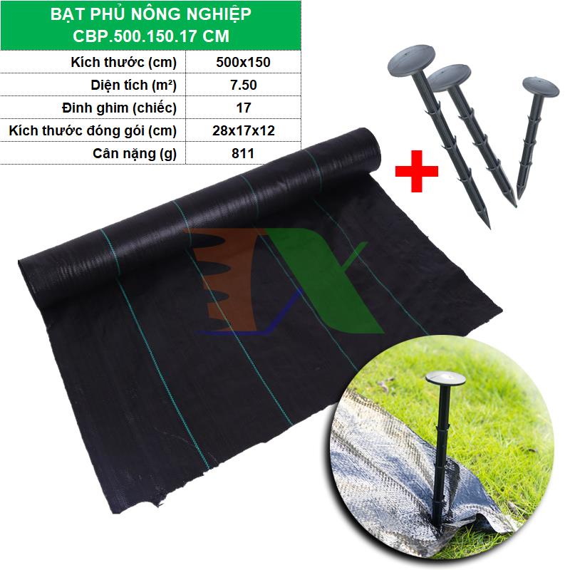 Giới thiệu Combo Bạt phủ nông nghiệp CBP.500.150.17, Bạt pp giữ ẩm cho đất diệt cỏ dại kèm Đinh ghim (500x150 cm) + 17 ghim