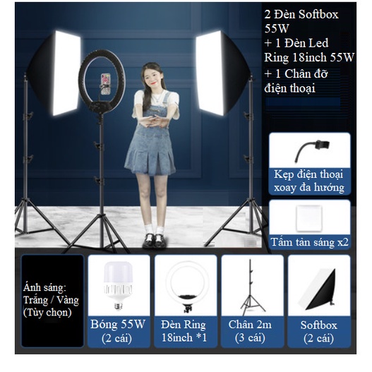 Bộ sản phẩm bao gồm: 3 chân 2m, 2 Softbox 50x70cm, 2 Bóng đèn Led 55W, 1 đèn HQ21-72W kèm kẹp điện thoại