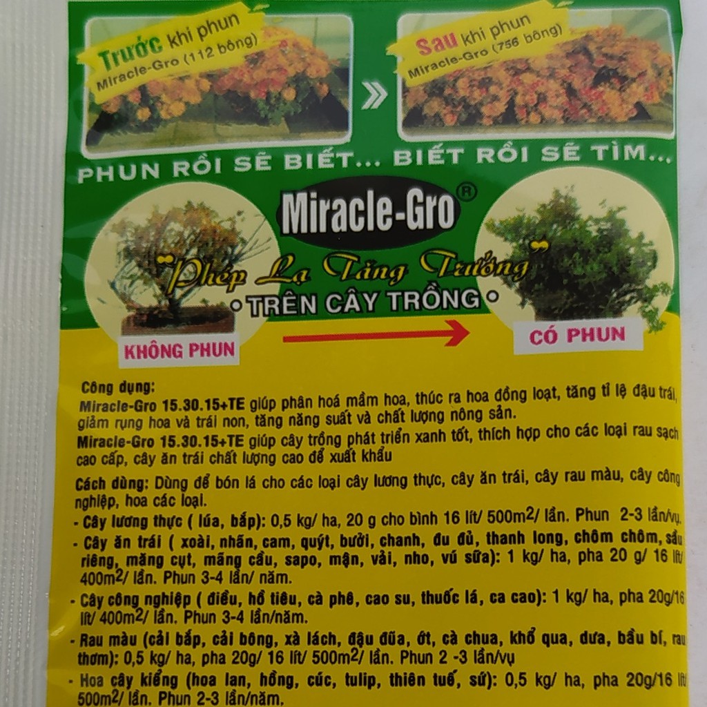 + Miracle Gro 15 - 30 - 15: Giúp cây trồng phát triển xanh tốt, làm cây cứng cáp, dẻo dai, mau ra hoa, tỷ lệ đậu trái cao.