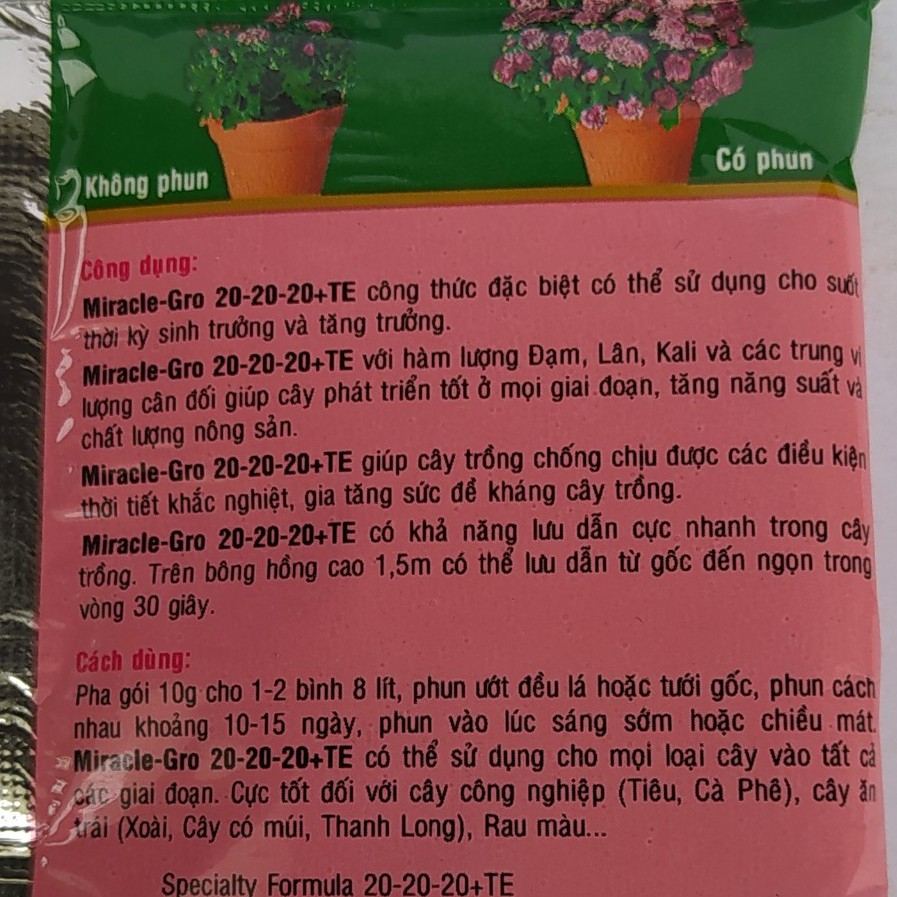 + Miracle Gro 20-20-20+Te là công thức đặc biệt có thể sử dụng cho suốt quá trình sinh trưởng và tăng trưởng.