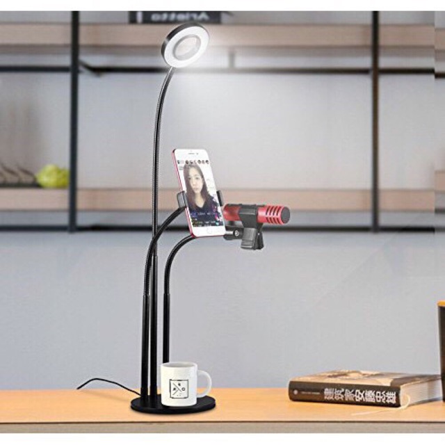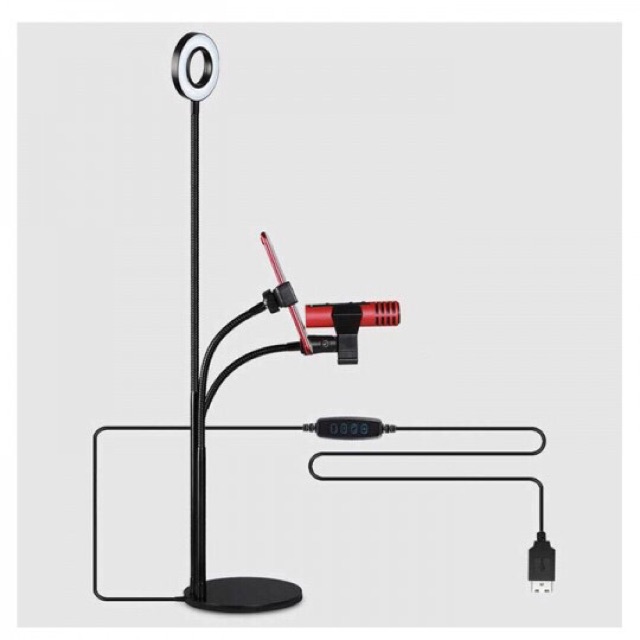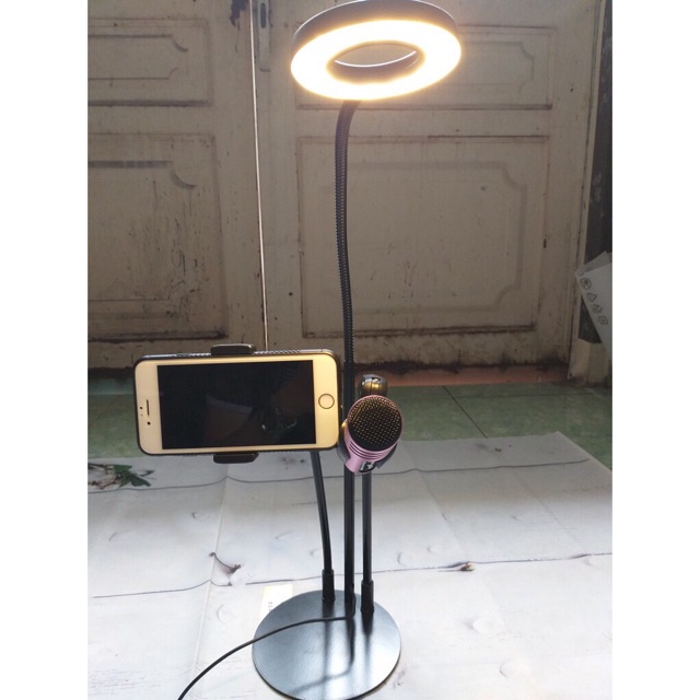 - Sản phẩm bao gồm: Đèn có cổng cắm USB, Giá đỡ điện thoại, Giá đỡ micro + 1 microphone kèm theo
