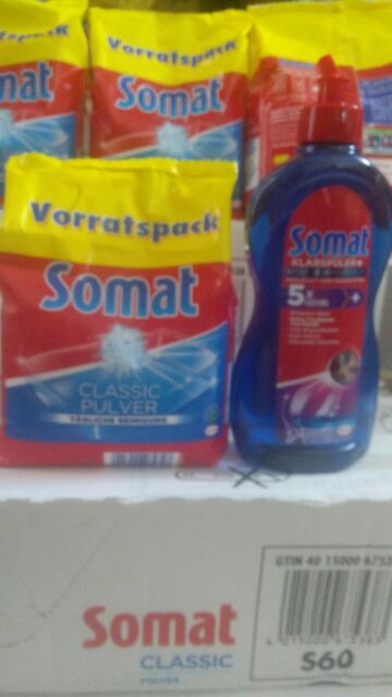 Bột Rửa bát chuyên dụng dành cho máy rửa bát SOMAT (mới ). Sản phẩm được nhập khẩu nguyên hộp từ Đức dùng chuyên dụng cho máy rửa bát.Khi sử dụng bật nắp khay đựng bột rửa của máy rửa bát, dùng thìa đổ khoảng 10 gam tới 20 gam bột rửa chuyên dụng tùy theo lượng bát đĩa cần rửa rồi đóng nắp khay đựng bột rửa lại trước khi vận hành máy. Đối với những loại máy không có khay đựng bột rửa có thể đổ hỗn hợp bột rửa bát chuyên dụng vào đáy máy