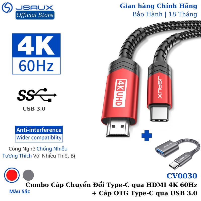 [Combo]Cáp Chuyển Đổi Type C sang HDMI CV0030 JSAUX 4K 60Hz 3M Và Cáp Chuyển Đổi Type C Sang Usb OTG 3.0 Cao Cấp CD0019**Cáp Chuyển Đổi Type C sang HDMI CV0030 JSAUX 4K 60Hz 3M Cho Tất Cả Thiết Bị Type C – Macbook, Samsung, Oppo, Huawei… - Đầu Cắm USB-C qua HDMI
