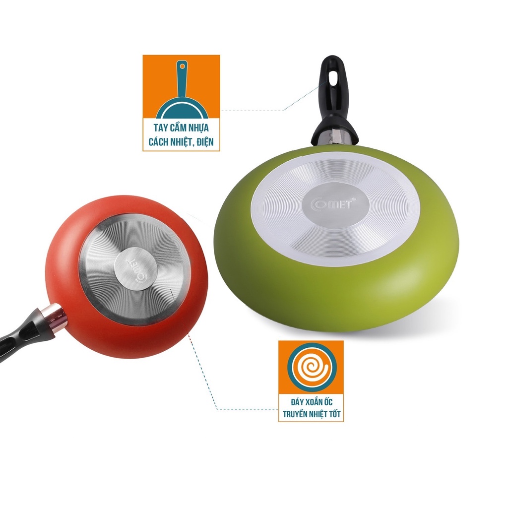 - Chảo chống dính Comet được thiết kế với màu sắc đẹp mắt, đem đến không gian sang trọng cho gian bếp nhà bạn.