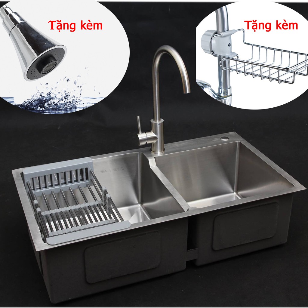 Combo chậu rửa bát, vòi rửa bát P2030 tặng kèm giá để đồ và đầu siêu tăng áp điều hướng nướcChậu rửa bát hai hố lệch kích thước 78x43x23cm