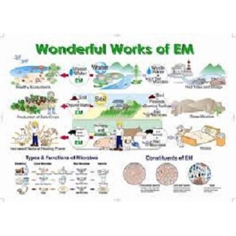 Chế phẩm vi sinh hữu hiệu Chế phẩm sinh học EM (Effective Microorganismas) hay còn gọi là Vi sinh vật hữu ích được GS.TS Teruo Higa (Nhật Bản) nuôi cấy thành công. Trong Chế phẩm này có hơn 80 loài vi sinh vật kỵ khí và hiếm khí thuộc các nhóm: Vi khuẩn quang hợp, vi khuẩn cố định Nitơ, xạ khuẩn, vi khuẩn lactic, nấm men... Chế phẩm sinh học EM hay chế phẩm EM gốc (chế phẩm EM1) thường được dùng để sản xuất ra các EM khác như: EM thứ cấp, EM5, EM-FPE, EM-Bokashi. Thông thường có các loại EM sau đây: EM thứ cấp là dung dịch EM có tác dụng phân giải các chất hữu cơ, khử trùng, làm sạch môi trường, cải thiện tính chất hoá lý của đất, tăng trưởng vật nuôi… EM5 là dung dịch EM có tác dụng hạn chế, phòng ngừa sâu – bệnh, tăng cường khả năng đề kháng, chống chịu của cây trồng, tăng trưởng của cây trồng… EM FPE (gọi là EM thực vật Fermented plant extract) là dung dịch EM có tác dụng kích thích sinh trưởng cây trồng và tăng năng suất, chất lượng cây trồng. EM-Bokashi có nhiều loại, dạng bột, như là Bokashi môi trường, Bokashi phân bón, Bokashi – thức ăn chăn nuôi… có tác dụng phân giải các chất hữu cơ, cung cấp dinh dưỡng cho cây trồng, cải tạo đất, tăng trưởng cây trồng và vật nuôi, chăn nuôi hạn chế dịch bệnh, làm sạch môi trường.