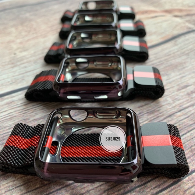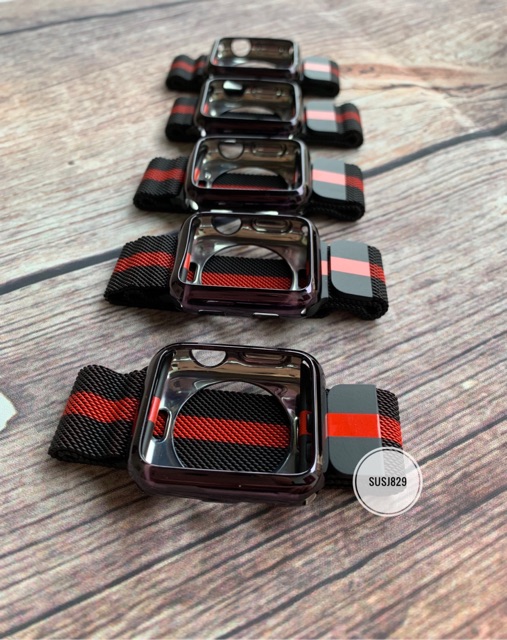 Combo dây milanese sọc đỏ+ốp bóng apple watch