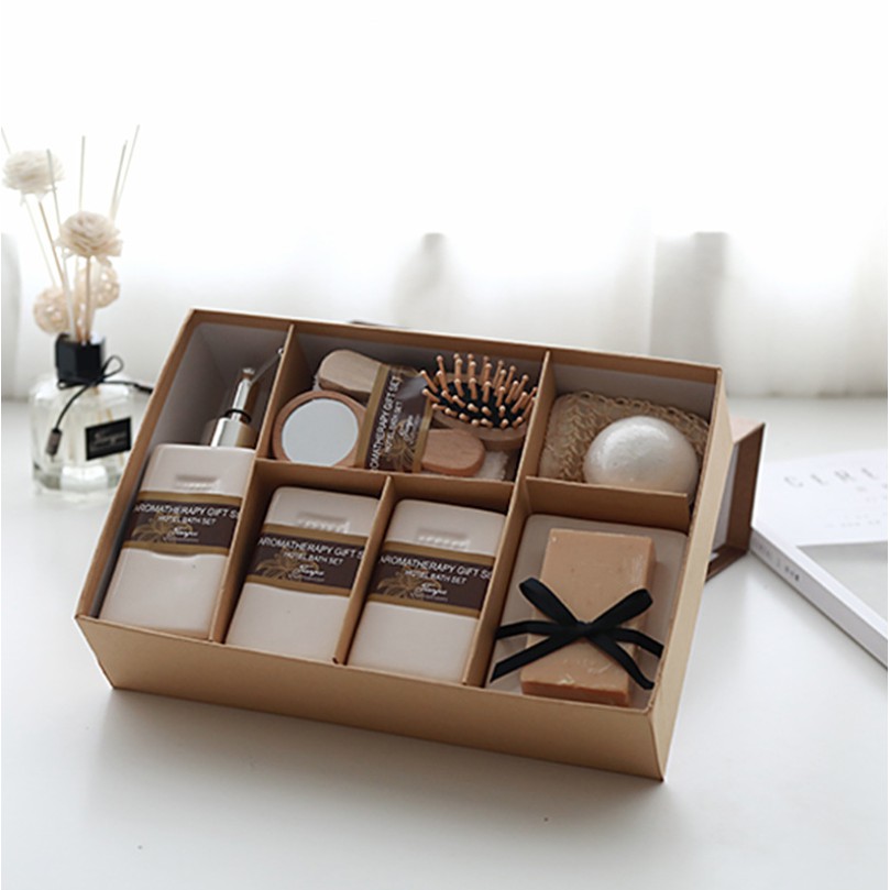 - Bộ sảnp phẩm – nhà tắm đi kèm set dụng cụ nhà tắm gốm được đóng hộp vô cùng đẹp mắt.