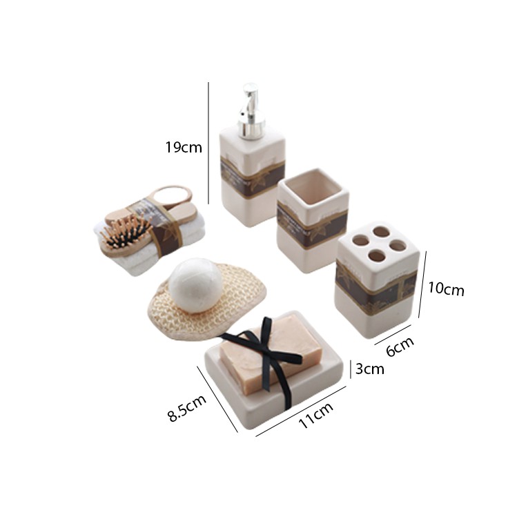 - Kích thước: Bình: 7.5x19 cm, ống cắm bàn chải: 6x10 cm, ly: 6x10 cm, để xà bông: 11*8.5 cm