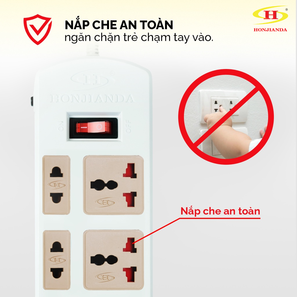 TRỌN BỘ BAO GỒM:Set 1: 01 Ổ cắm điện Honjianda 0448B 3m + miếng dán ổ điện + set nút bịt an toàn + móc treo tiện lợi