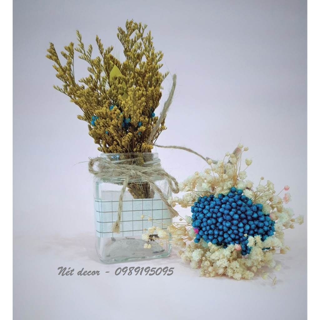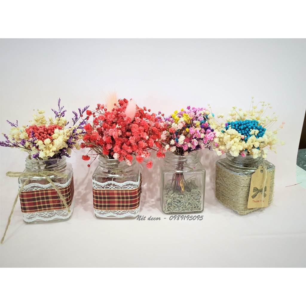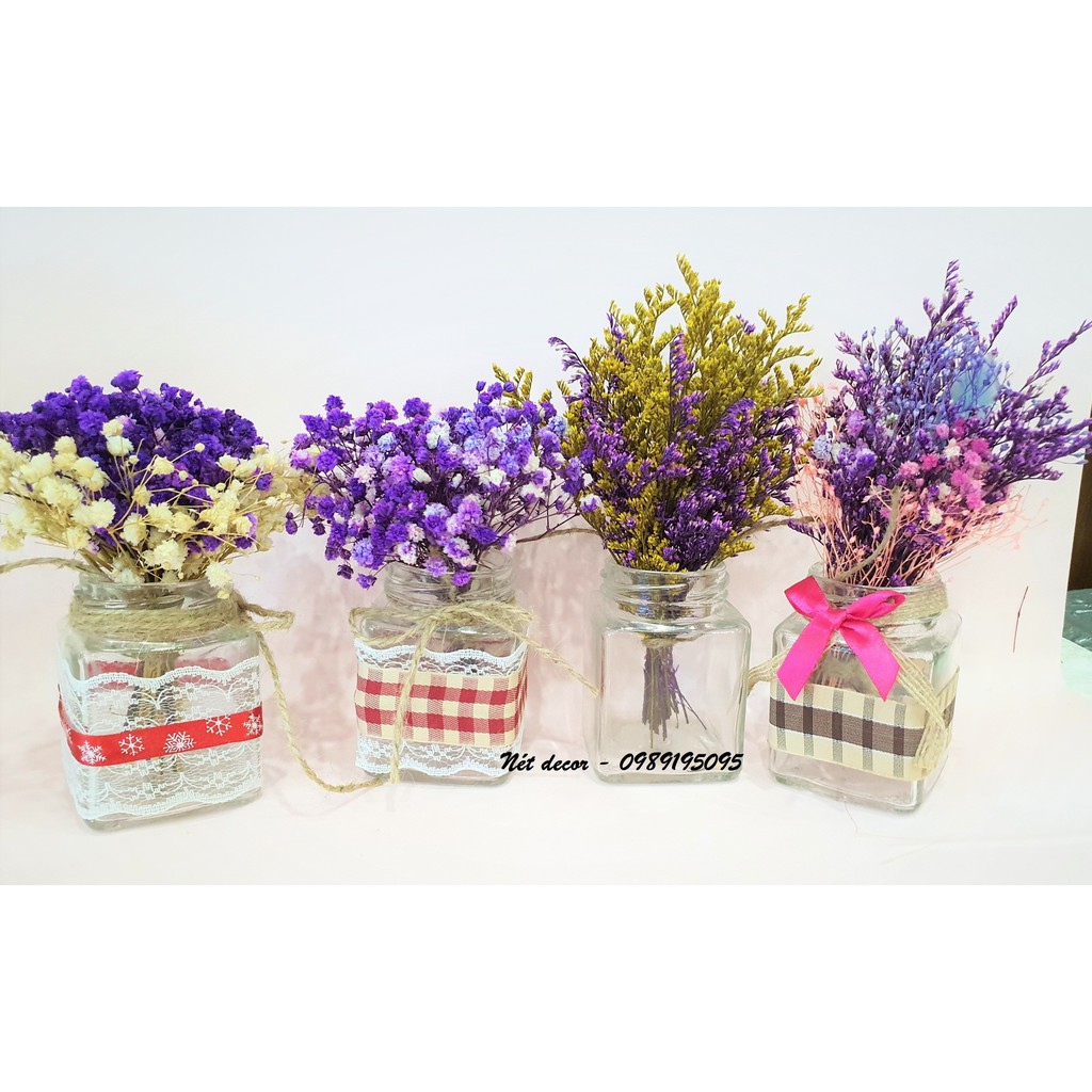 Combo lọ thủy tinh decor sẵn kèm hoa khô mix nhiều loạilọ thủy tinh cao 7cm , decor bằng dây cói , ren , ruy băng ... cả lọ và hoa cao cỡ 15-20cm tùy mẫu hoa ạ