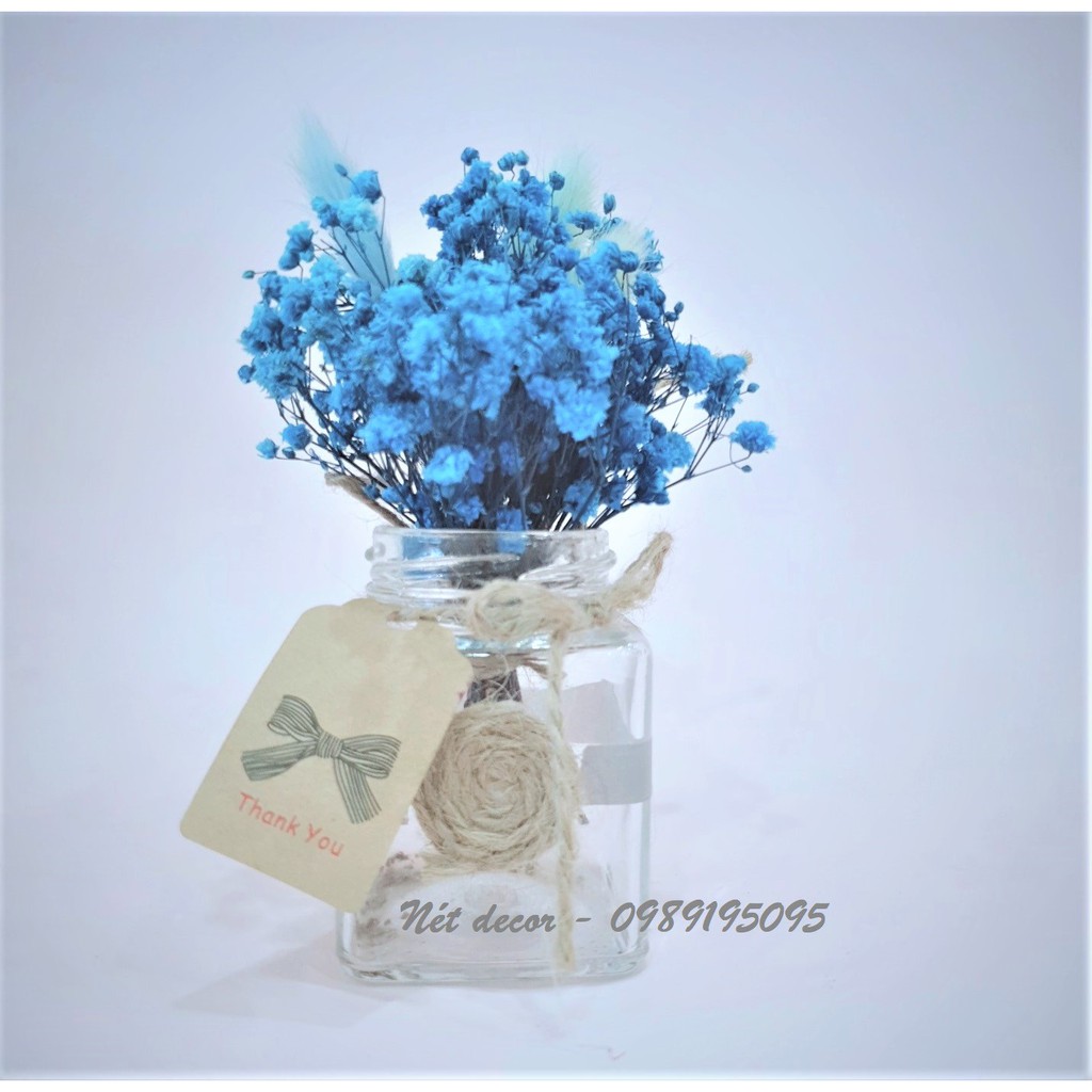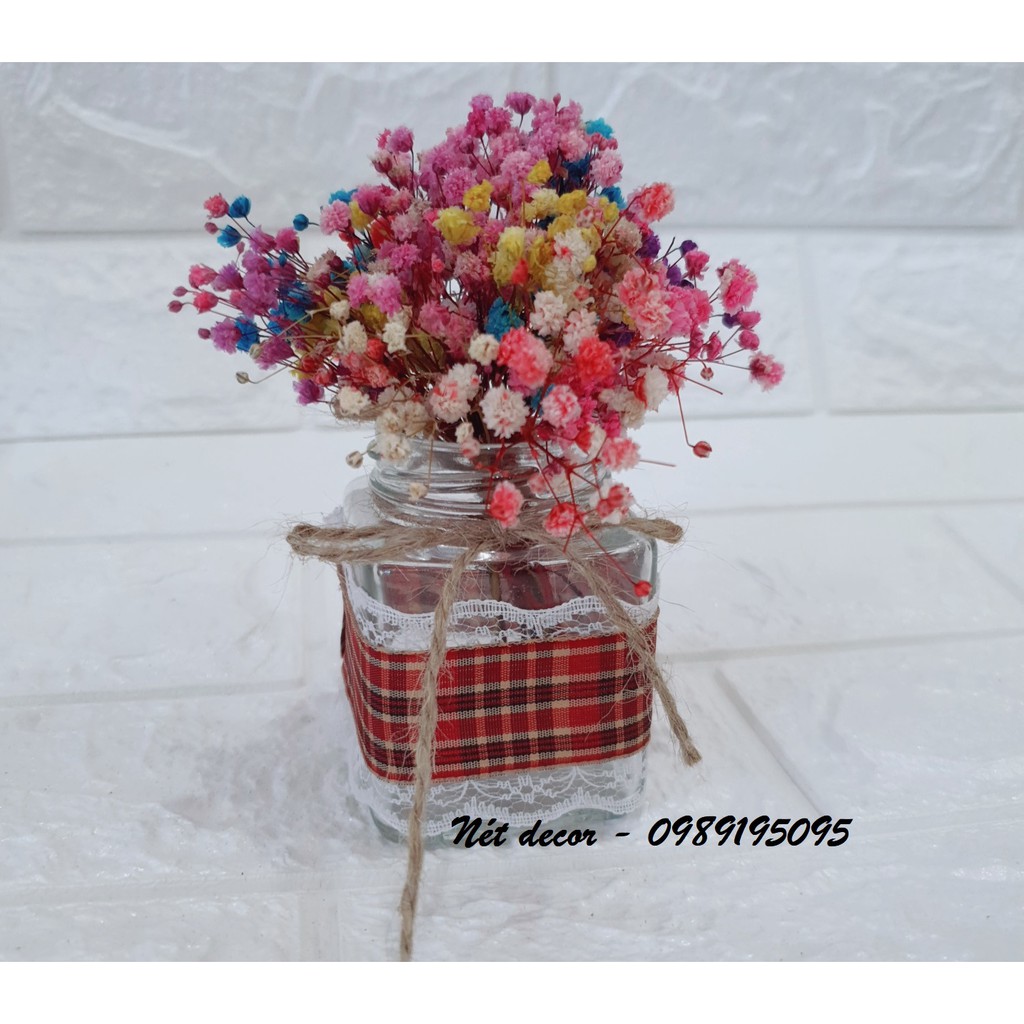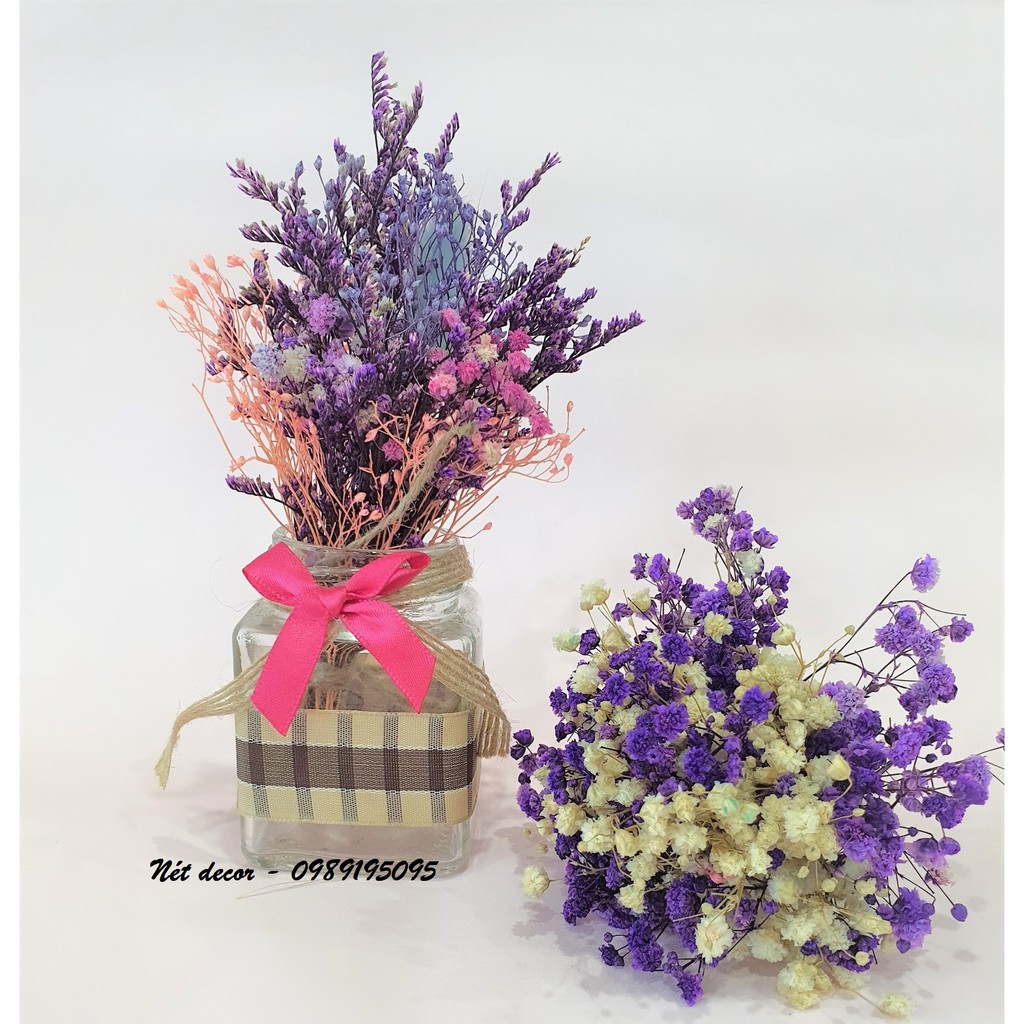 Combo lọ thủy tinh decor sẵn kèm hoa khô mix nhiều loạilọ thủy tinh cao 7cm , decor bằng dây cói , ren , ruy băng ... cả lọ và hoa cao cỡ 15-20cm tùy mẫu hoa ạ