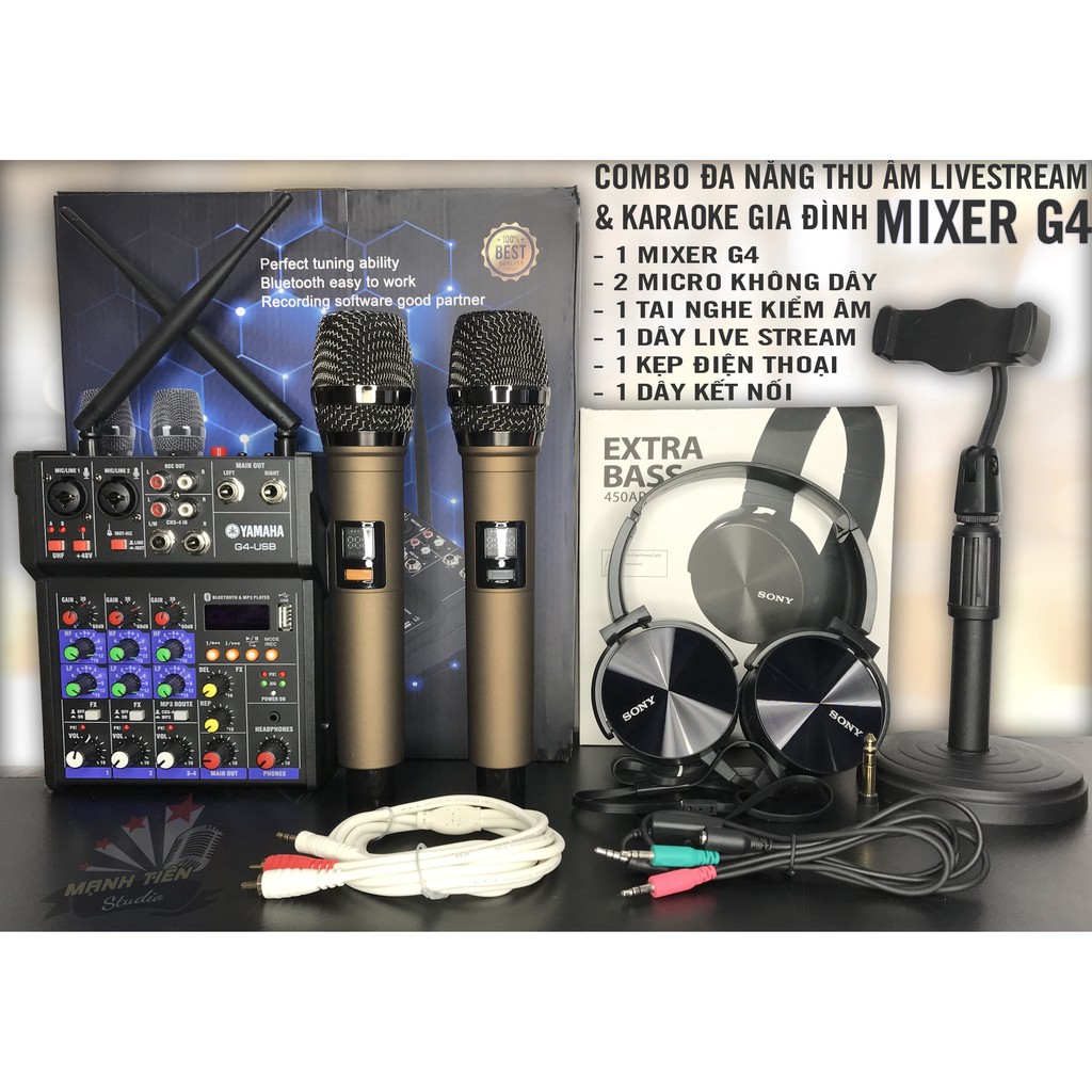 [COMBO HOT] Bộ thu âm live stream đa năng và karaoke gia đình Mixer G4 kèm full phụ kiện dây jack đầy đủ