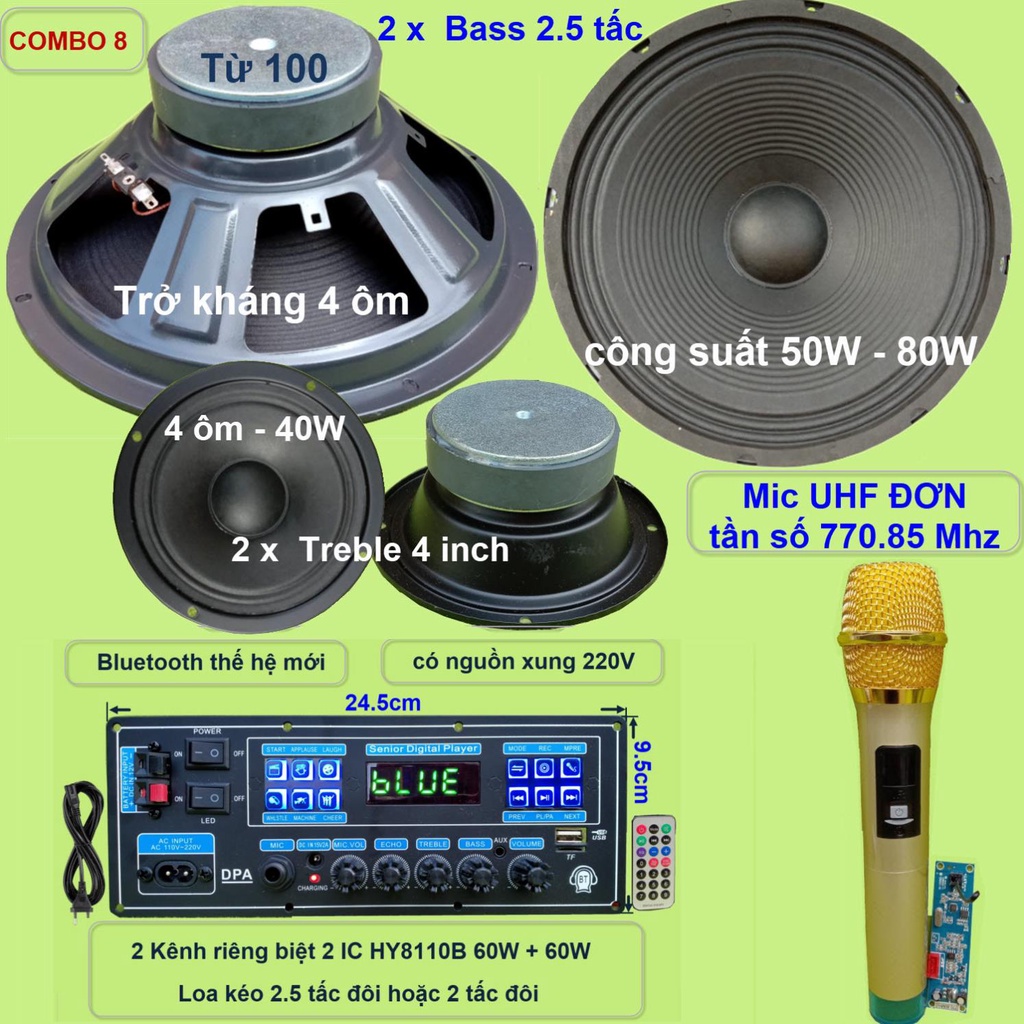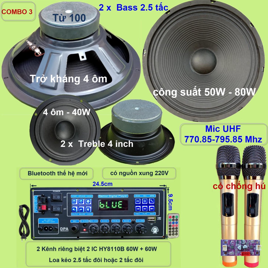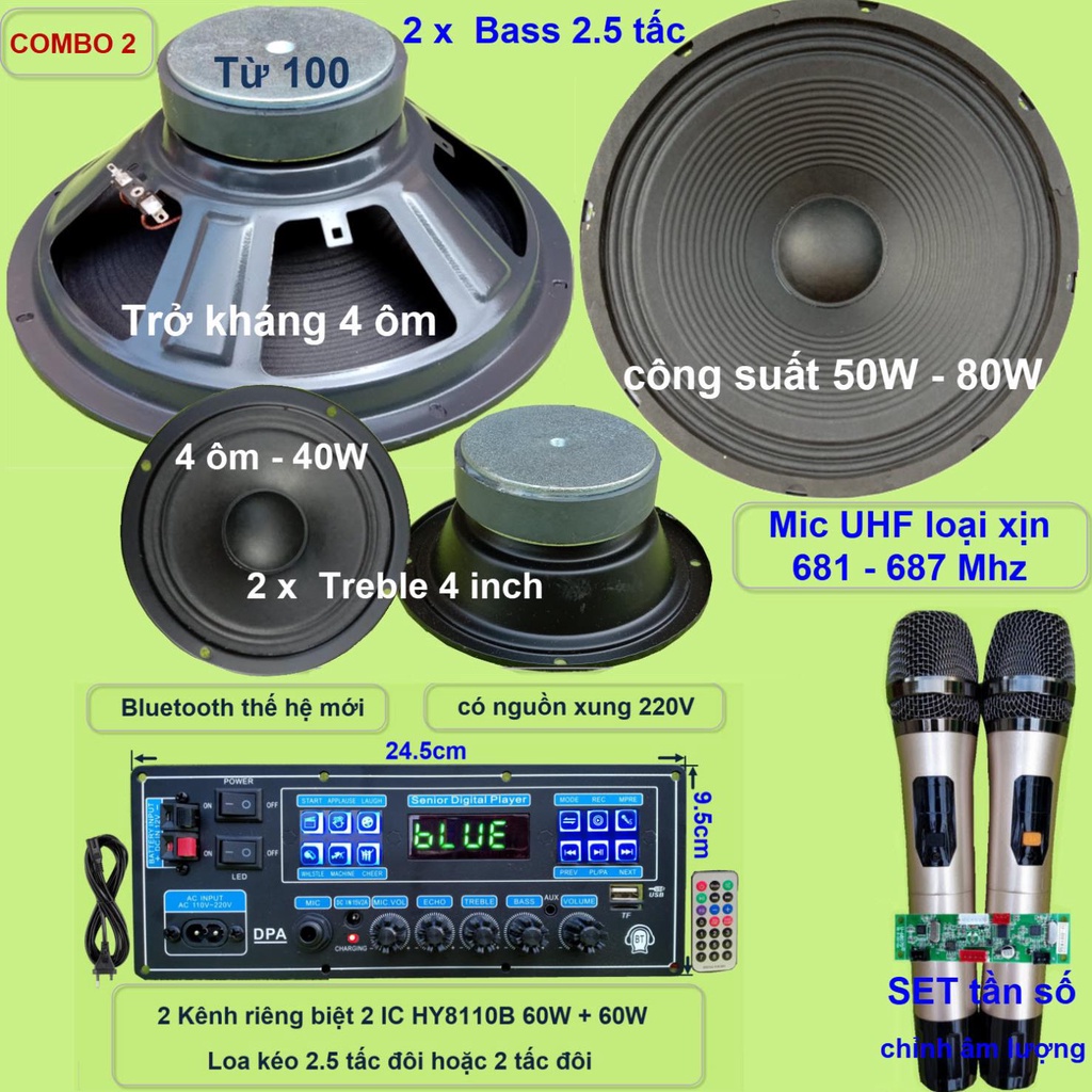 Combo Mạch loa kéo 2.5 tấc đôi 2 IC HY8110B 60W + 60W có nguồn xung 220V - Bluetooth thế hệ mớiCác combo chỉ khác nhau về bộ Micro. Các linh kiện khác của các combo là giống nhau bao gồm: 1 mạch loa kéo + phụ kiện (remote + dây nguồn 220V + dây bình ắc qui + dây loa) + 2 Bass 2.5 tấc + 2 Treble 4 inch