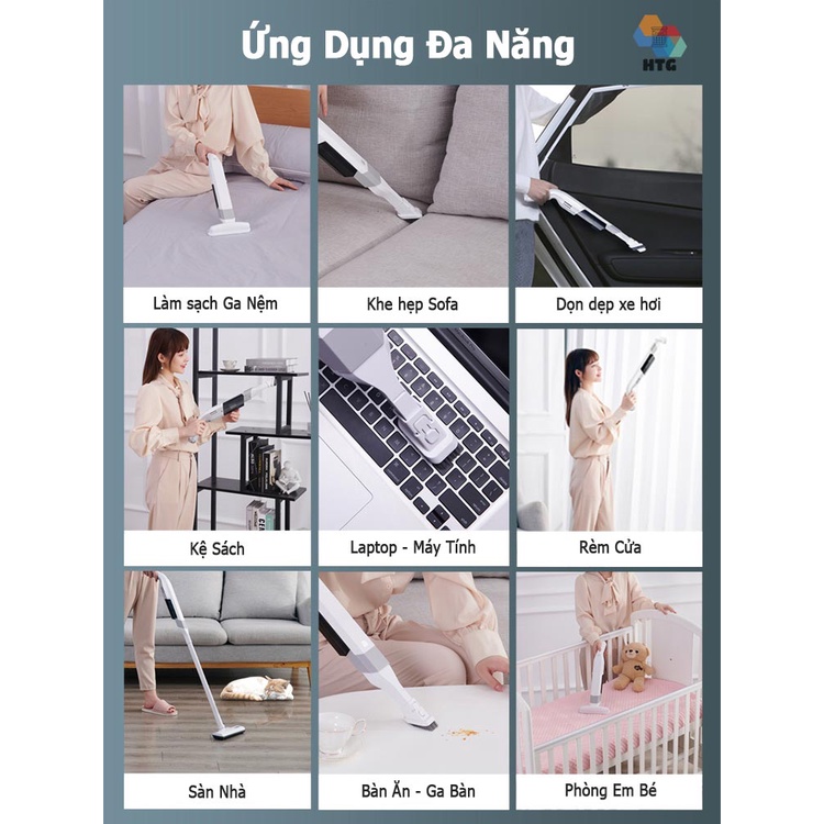 - Bộ sản phẩm gồm: x1 đầu hút sàn; x1 đầu hút nệm, x1 đầu hút 2 in 1, x1 Adapter sạc pin; x1 Sách Hướng dẫn; x1 Ống nối dài; x1 Khớp kết nối; x1 Máy chủ; x1 bộ lọc (2 lớp); x1 Hộp đựng bụi; x1 Dây treo; x1 phiếu bảo hành HTG
