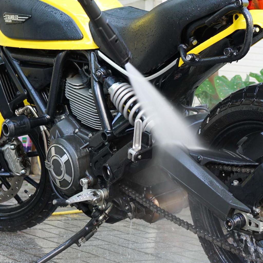 - Hệ thống đèn báo áp lực trên tay cầm giúp hiển thị ba chế độ phun và chế độ phun hóa chất phù hợp cho nhiều bề mặt làm sạch khác nhau.